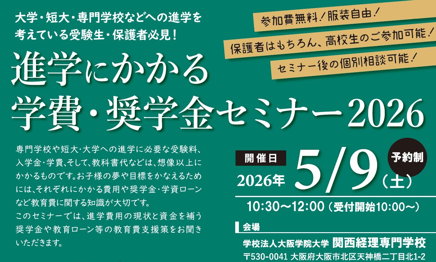 TOPICS オープンキャンパス 6/1~AO入試 エントリー受付開始 不動産業界必須資格宅建士を取得しよう! 関西経理専門学校6つの特色 1関西最古の歴史を誇る卒業生約40,000人のネットワーク 23学科6コースでめざす資格に一直線 3実業界で活躍中の教員による生きた授業 4地上7階地下2階の専用校舎充実の施設・設備 5グループ校である「大阪学院大学」への編入可能 6最寄駅から徒歩すぐの抜群アクセス COURSE 経理分野 経理実務学科 経理実務コース 1年制 経理専門学科 税理士基礎コース 2年制 経理専攻コース 2年制 経営分野 経営学科 経営コース 2年制 不動産ビジネスコース 2年制 通信制 経理専門学科 経理専攻コース 2年制 NEWS 2026-04-24お知らせ 「進学にかかる学費・奨学金セミナー」開催! ※大学・短大・専門学校などへの進学を考えている受験生・保護者様必見! 2026-02-24入試 追加募集なし・募集終了/外国人留学生入試 2026-02-09お知らせ 輝く資格取得者/日本商工会議所WEBページに掲載されました 2025-12-22お知らせ 公式サイトのメンテナンス(閲覧不可日時12/29)のお知らせ 2025-12-15お知らせ 経理 2025年度 冬期休暇中の事務の取扱いについて(お知らせ) 2025-10-27入試 外国人留学生入試について(11月29日入試以降は募集終了) 2025-10-15お知らせ 令和7年(2025年)教育機関の選定結果「適正校(クラスⅠ)」(大阪出入国在留管理局) 2025-10-15お知らせ 公式サイトのメンテナンス(閲覧不可日時10/17)のお知らせ 2025-09-04お知らせ 経理 9/5(金)台風接近に伴う授業の取り扱いについて 2025-07-19お知らせ 経理2025年度 夏期休暇中の事務の取扱いについて(お知らせ) 2024-11-28お知らせ 経理 2024年度 冬期休暇中の事務の取扱いについて(お知らせ) 2024-10-25お知らせ 令和6年(2024年)教育機関の選定結果「適正校(クラスⅠ)」(大阪出入国在留管理局) 2024-09-06イベント 経理9/7(土)オープンキャンパス・入試相談会の中止について 2024-08-29入試 外国人留学生入試 8月31日(土)中止と9月7日(土)実施ついて【8/29 14:00掲載】関西経理専門学校 2024-07-12お知らせ 経理2024年度 夏期休暇中の事務の取扱いについて(お知らせ) 2024-02-21お知らせ 公式Facebook(関西経理専門学校)一時停止について 2024-02-17入試 3月29日出願締切/2024年4月入学の通信制入試(追加日程)実施 2024-02-07入試 追加募集/2024年4月入学の外国人留学生制入試 2023-12-13お知らせ 経理 2023年度 冬期休暇中の事務の取扱いについて(お知らせ) 2023-10-20お知らせ 教育機関の選定結果「適正校(クラスⅠ)」(大阪出入国在留管理局) 2023-10-19入試 ウクライナからの学生の受け入れについて 2023-07-11お知らせ 経理2023年度 夏期休暇中の事務の取扱いについて(お知らせ) 2023-05-06お知らせ 2023年5月8日以降の授業等の実施方針について 2022-12-24お知らせ 経理 2022年度 冬期休暇中の事務の取扱いについて(お知らせ) 2022-07-28お知らせ 経理 2022年度 夏期休暇中の事務の取扱いについて(お知らせ) 2021-12-27お知らせ 経理 2021年度 冬期休暇中の事務の取扱いについて(お知らせ) 2021-09-14お知らせ 緊急事態措置の延長に伴う本校の対応について(遠隔授業期間の9/30まで延長) 2021-08-31お知らせ 緊急事態措置の延長に伴う本校の対応について(~9/12) 2021-08-02お知らせ 緊急事態措置に伴う本校の対応について(8/2~8/31) 2021-06-19お知らせ 緊急事態宣言解除に伴う本校の対応について(6/21~対面授業の再開) 2021-06-01お知らせ 緊急事態措置の延長に伴う本校の対応について(遠隔授業期間の6/20まで延長) 2021-05-08お知らせ 緊急事態措置の延長に伴う本校の対応について(遠隔授業期間の5/31まで延長) 2021-04-28お知らせ 緊急事態措置に基づく本校の対応について(遠隔授業期間の5/11まで延長) 2021-04-17お知らせ 2021年4月19日(月)から5月5日(水)の授業について 2021-01-20お知らせ 検温済証明リストバンドの着用について 2020-05-01お知らせ 【採用ご担当者様】学生への求人情報ご提供のお願い ALL NEWS